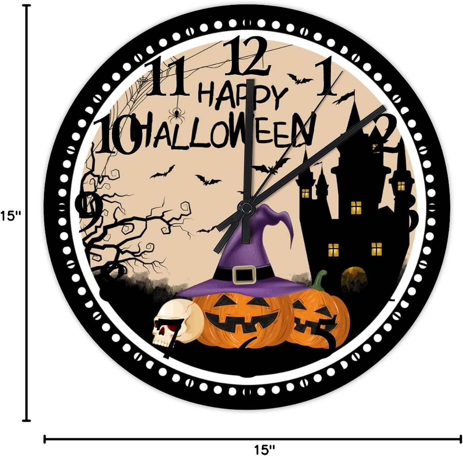 Happy Halloween Pumpkin Hunted House Clocks Witch Hat with Evil Pumpkin wall clock for bedroom Battery Operated Arabic Numbers Clock Kids Room and Kitchen 15 Inch??Details:Product Size: 10/12/15 inches, (25/30/38 cm)Shape:RoundMaterial: Wood??Functional Home DécorThis halloween Jack-o'-Lantern Pumkin clock aren't just for timekeeping. They function as beautiful wall decor pieces, beyond telling time, and bring both style and purpose to any room.A charming home decoration, very suitable as a housewarming gift, making the home more warm. Suitable for any room, you can put it in any room such as home, living room, master bedroom, kitchen, bathroom, home office, etc. Elegant, durable and stylish.??Clock Hands Troubleshooting Guide:Check that the battery is a new battery and not a used battery.Make sure the hour and minute hands are not crossing or touching each other. If they are, adjust the hands by slightly bending them.See if the center pin that holds the hands together is firmly pushed in or screwed on, depending on the style.If hands are still not moving after the above, please reference the hands replacement instructions included with all of our open face clocks.