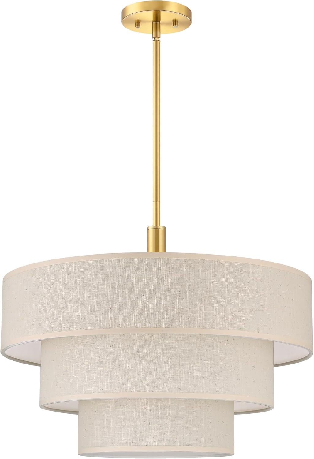 3 Tier Cream Linen Drum Fabric Pendant Light Modern Farmhouse Decor 7 Lights 24 Inch Retro Gold Finish for Kitchen Living Room Dining Room Corridor Hallway