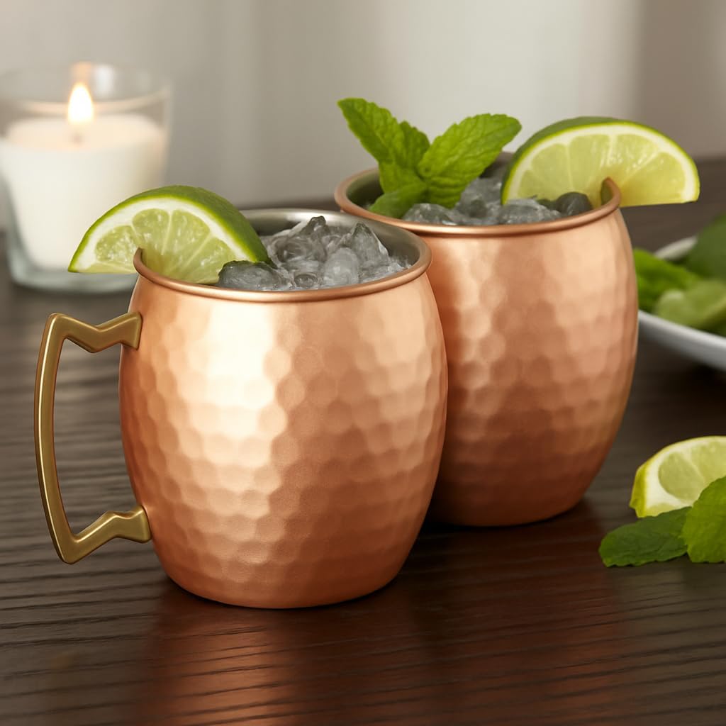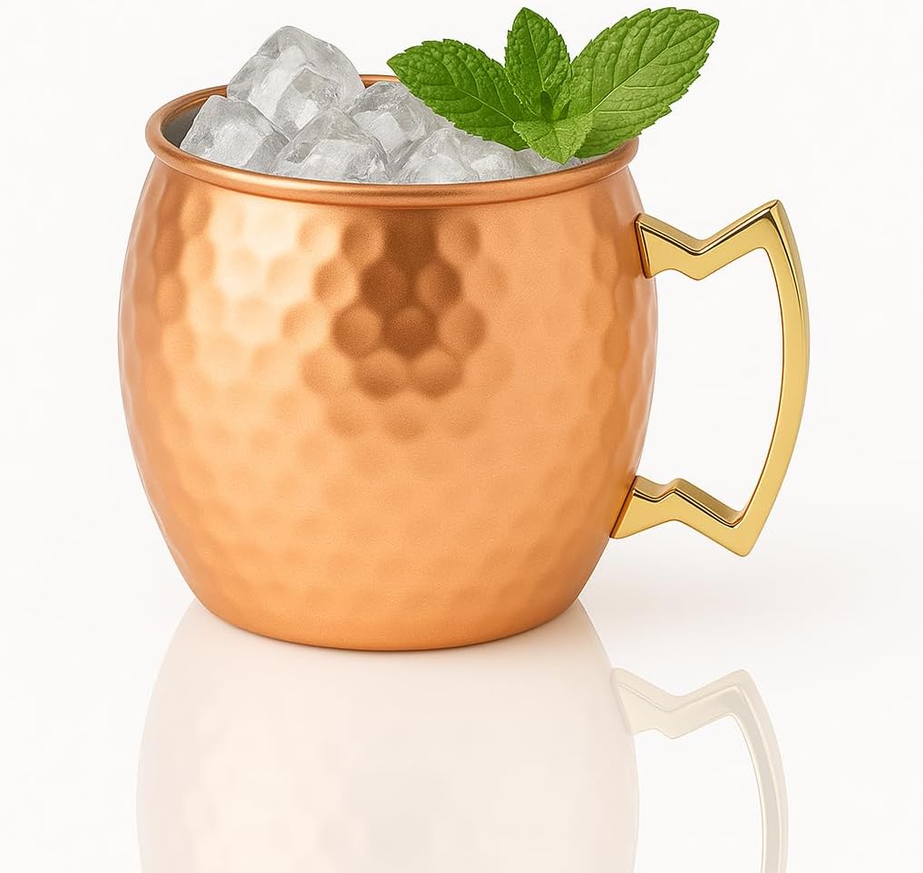Modern Home is proud to offer an original classic done right. Mule drinks have taken over the country's most popular watering holes, and the only proper way to serve these refreshing cocktails is in a 100% copper mug. With rising costs of copper, many manufacturers have resorted to using stainless steel and spraying imitation mugs with a copper finish. The Modern Home Moscow Mule mug is comprised of a vessel that is 100% copper. No additives, no coatings, only copper. Finished with a copper handle, our mule mugs are entirely handmade in India. Created in 1947 by a vodka aficionado and ginger beer importer, the Moscow Mule has long been a beloved cocktail traditionally served in a copper mug. The Moscow Mule is traditionally served in solid copper mugs. The most scientific benefit of using copper Moscow mule mugs is temperature. For centuries, the best drinkers have known that chilled drinks in copper cups offer an extra-cool sensation, due to the metal quickly taking on the icy temperature of the cocktail. The rim of the mug becomes chilly almost instantly, offering a frozen sensation on your lips. The cold metal is highly effective at insulating the cold temperature of any liquid, especially good for summertime drinking, and deflecting heat from the sun. The handle of the mug helps maintain drink temperature, as well, keeping the near 100-degree body heat of your hand away from the walls of the mug, and your Moscow Mule safely chilled inside. This high-quality mug is handcrafted from solid copper and the inside is lined with nickel. Each piece is unique just for you. Each Copper beer mug measures 3.5 inches in diameter and 3.75 inches tall and holds 16 ounces of your favorite mule. Included with each order is our own mule recipe guide featuring a variety of mule variations. Our mugs are completely handmade in India.