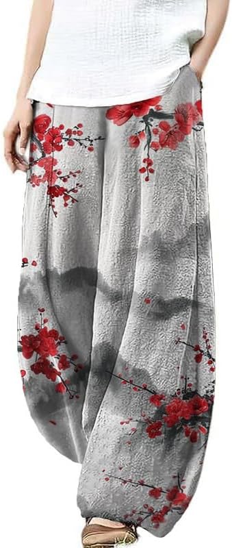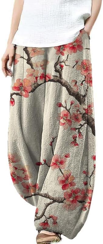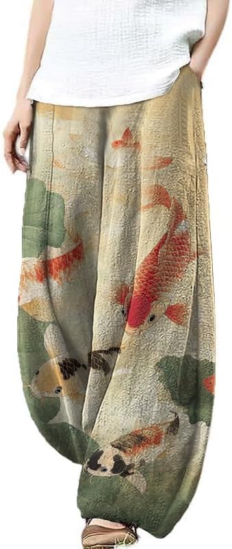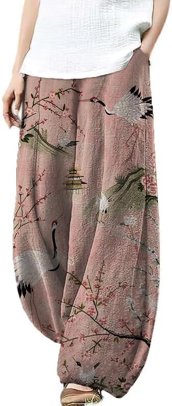 YODUTRY Japanese Artistic Pattern Wide Leg Pants for Women Waist Elastic Lounge Lantern Trousers with Pockets