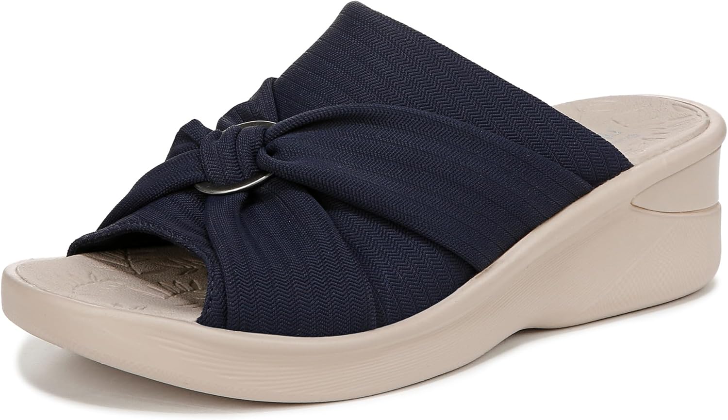 Slide into cool comfort! Hot days call for sporting these breezy slide sandals with a wedge heel and stylish bow detail. Stretch fabric upper with a round toe. BZEES Air Step Technology: Designed so you’ll feel weightless, energized and free. Ultra Lightweight: Step lightly with a nearly weightless feel. Dynamic Stretch Fabrics: Move freely in shoes with built-in stretch. FreeFoam™ Comfort: Low pressure insoles with maximum foot contact and cushy arch support. Odor Control technology. 3/4 inch platform, 1 3/4 inch wedge heel. Get Width It: Countless pairs of Bzees come in wide width shoes for women. Machine Washable: Wash on cold and air dry.