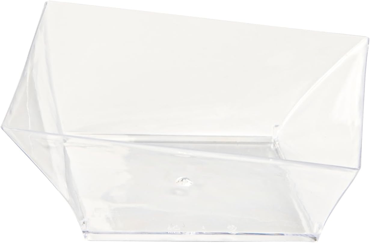 Take your presentation to the next level with our Mini Serve 7-ounce Square Clear Plastic Small Girata Bowls. With a premium plastic construction, these decorative bowls are durable and ideal for serving wet, dry, and cold food items at your parties. These clear bowls are designed in a unique square shape to effortlessly enhance the food they contain while adding a touch of modern elegance to your table setting. Featuring a crystal clear finish, these serving bowls allow you to showcase your delectable treats and dazzle your guests beautifully. These square bowls can hold up to 7 ounces, providing ample room for serving your culinary creations. Conveniently disposable, these salad bowls enable quick and easy post-event cleanup. These snack bowls measure 3.9 inches in length by 3.9 inches in width by 1.4 inches in height and can hold up to 7 ounces. Sold in a 100 count box.